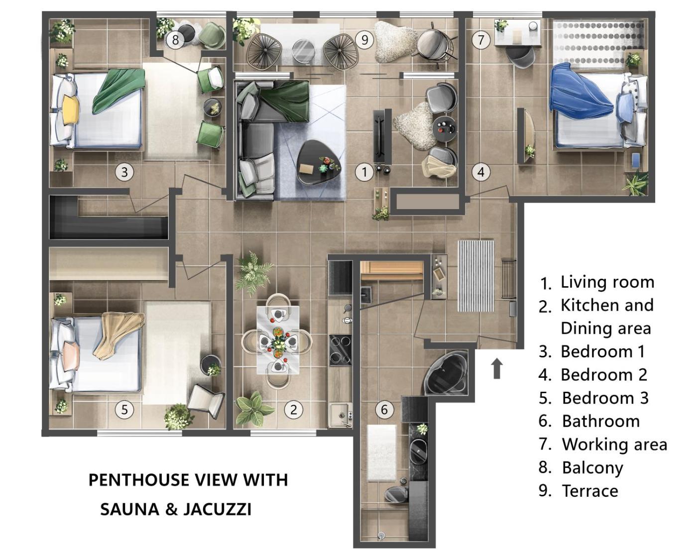 Three-Bedroom Premium Apartment with Balcony. Guests will have a special experience as this apartment provides a hot tub, a spa bath and a sauna. This spacious apartment comprises 1 living room, 3 separate bedrooms and 1 bathroom with a shower and free toiletries. The well-fitted kitchen features a stovetop, a refrigerator, a dishwasher and kitchenware. This air-conditioned apartment consists of a dining area, a flat-screen TV with streaming services a washing machine and a terrace. The unit offers 4 beds.